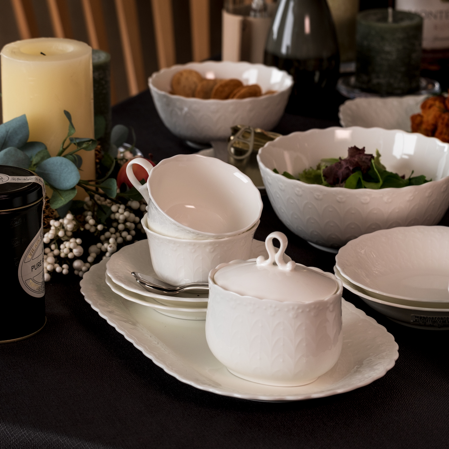 可憐で明るく、優美な印象をもつシルキーホワイトですが、ここではダークグレーのテーブルクロスを使うことで、冬らしく、シックな雰囲気に様変わりします。