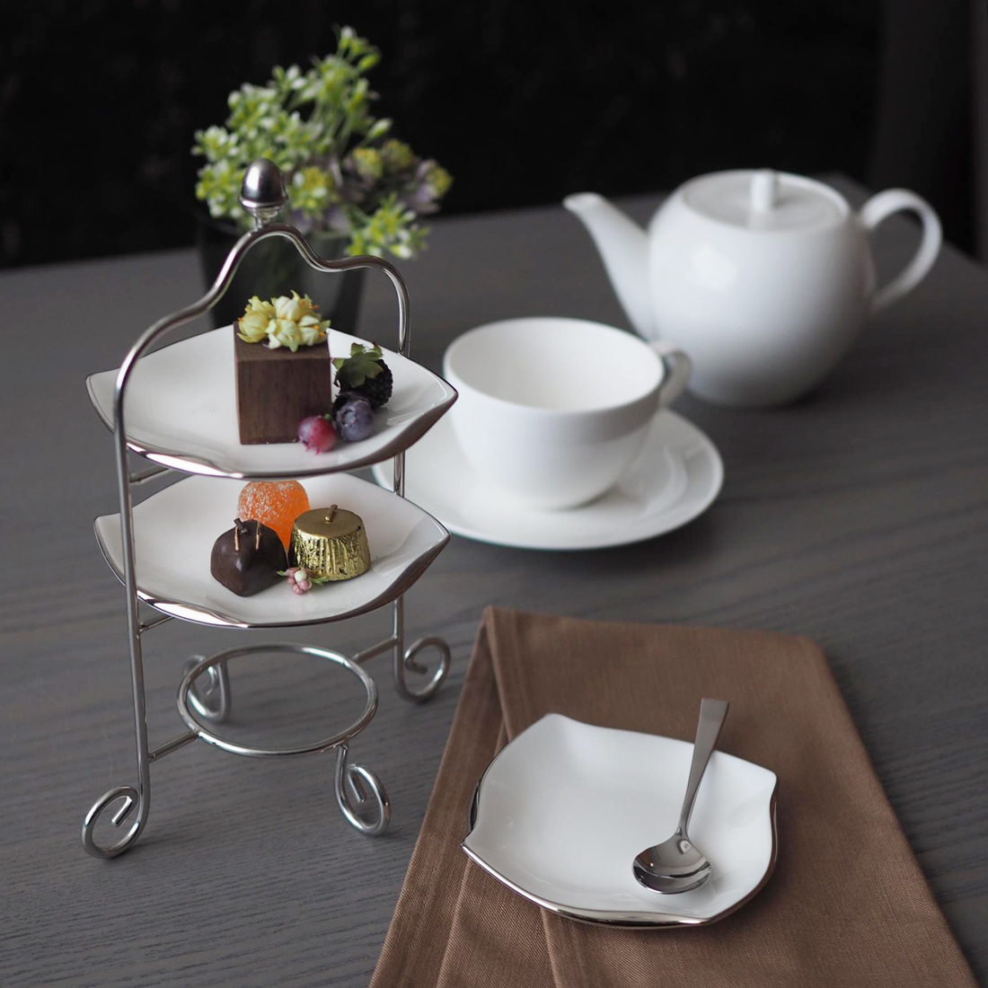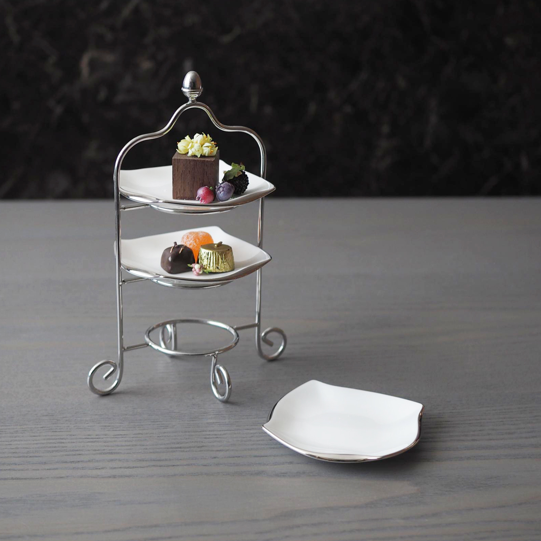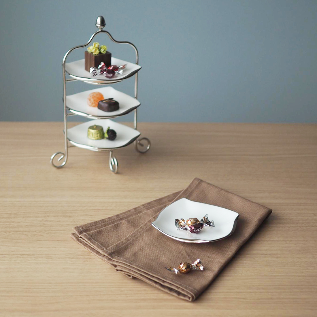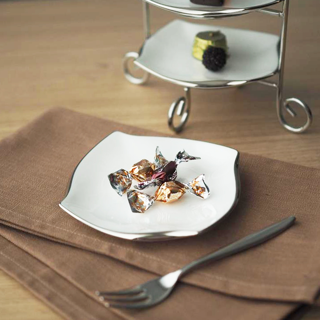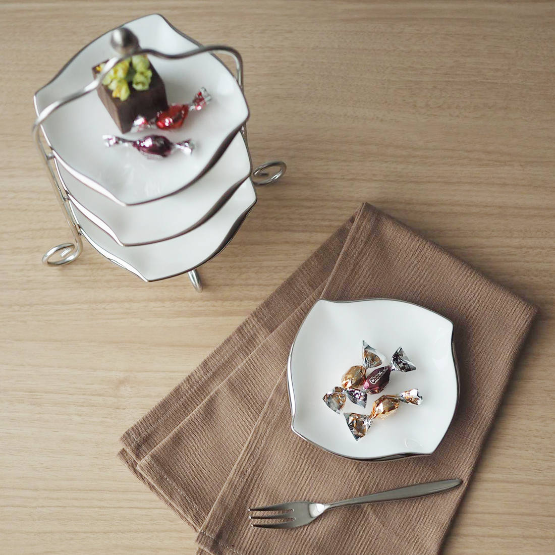 対角13cmのプレート。銀色のふちどりがスタイリッシュ。薬味やお菓子用のお皿に。