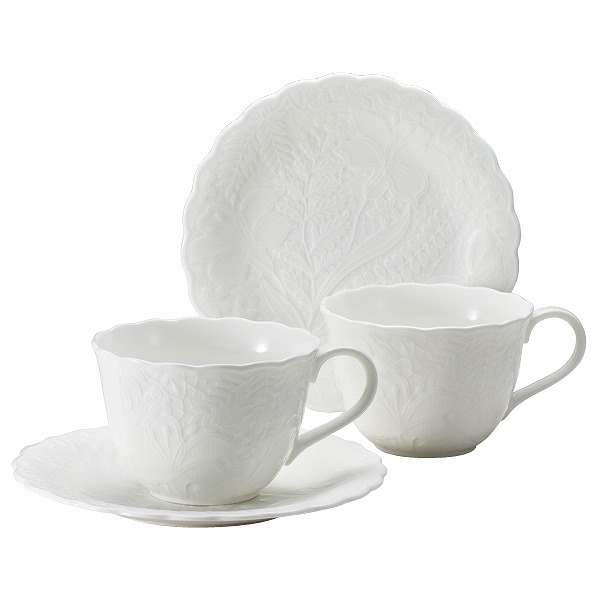 毎日の食卓に活躍するプレートとマグカップのセット。プレートはモーニングマグのソーサーとしてもご使用いただけます。プレートとモーニングマグのそれぞれに繊細で美しいレース模様を施しています。