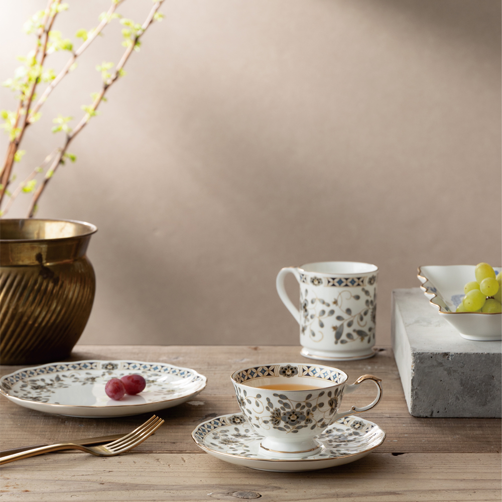 光りを受けて輝くシャンパンゴールドの金彩と深みのある黒の装飾で贅沢なティータイムを彩るブラックミラノシリーズから日頃のご愛顧に感謝を込めて、数量限定のお得なスプーンとカップ&ソーサーのティーセットです。