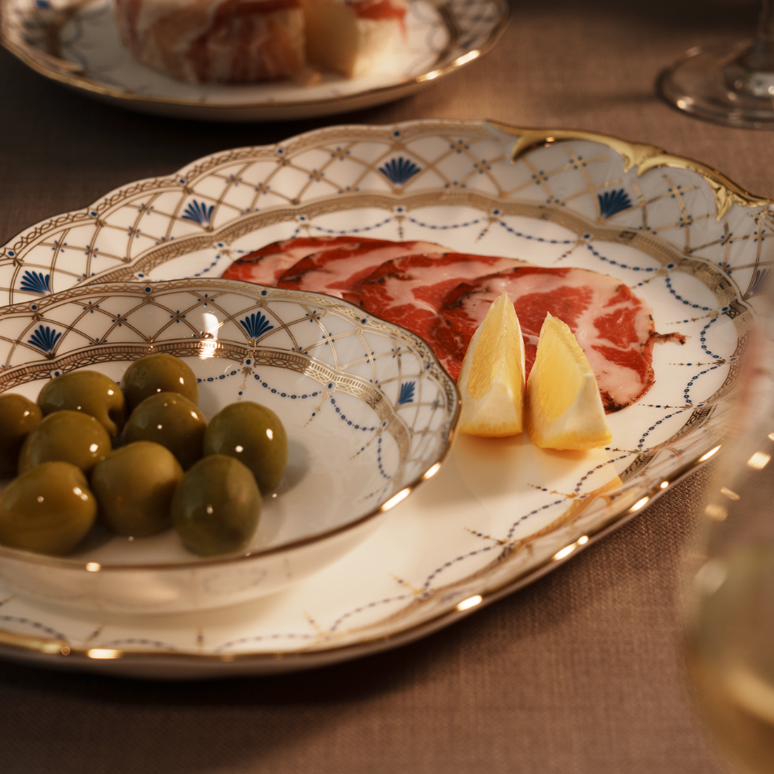宝石のような深みのあるブルーと煌めく金彩がふんだんに施された贅沢な装飾のプラター。