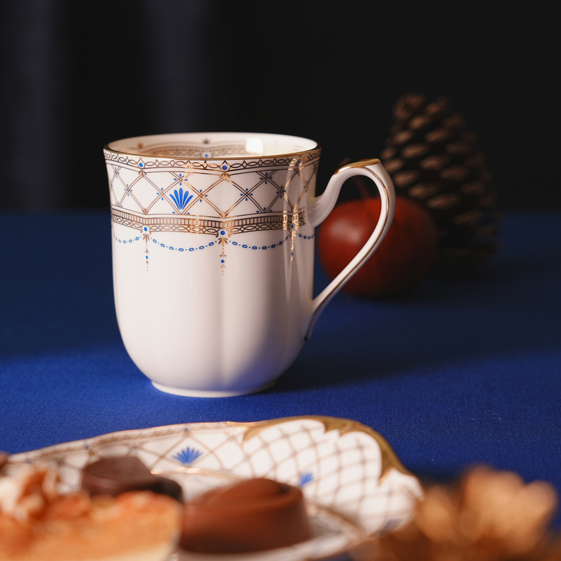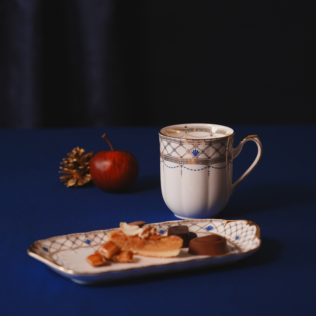 ステージに立つ歌姫のドレスを思わせる優雅な装飾をマグの側面からハンドルにかけて贅沢に施しました。繊細な金装飾が輝き、飲み物を一層華やかに彩ります。 プチデッシュと合わせてお手軽に上質なコーディネートを楽しむこともおすすめです。