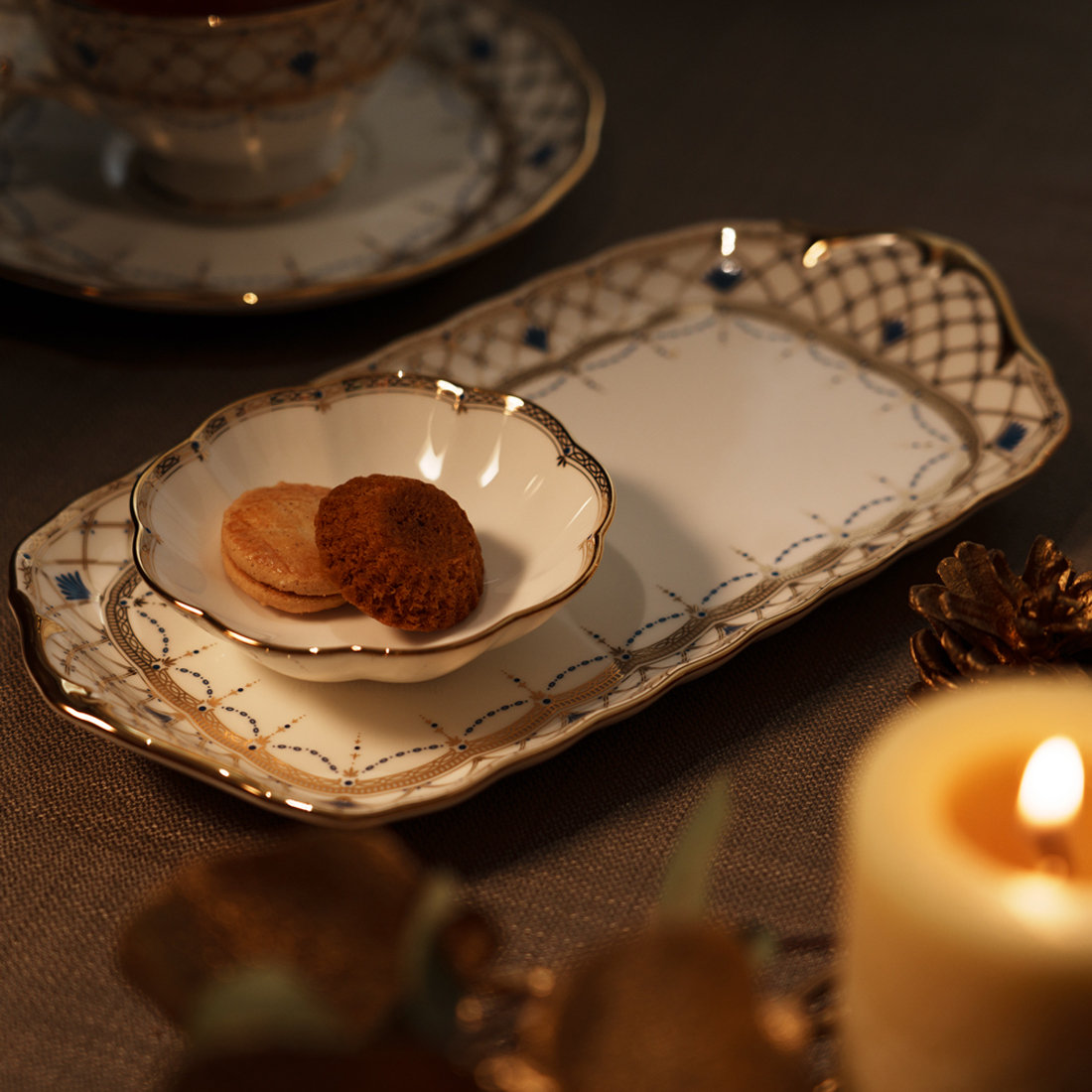 手のひらサイズのプチデッシュは、小さなお菓子やフルーツなどをちょこんと乗せるだけでコーディネートが完成する優れものです。カップ&ソーサーやマグと一緒に使うとお手軽にティータイムが楽しめます。お花のような可愛らしい形状に、控えめながら上質な装飾が施されています。