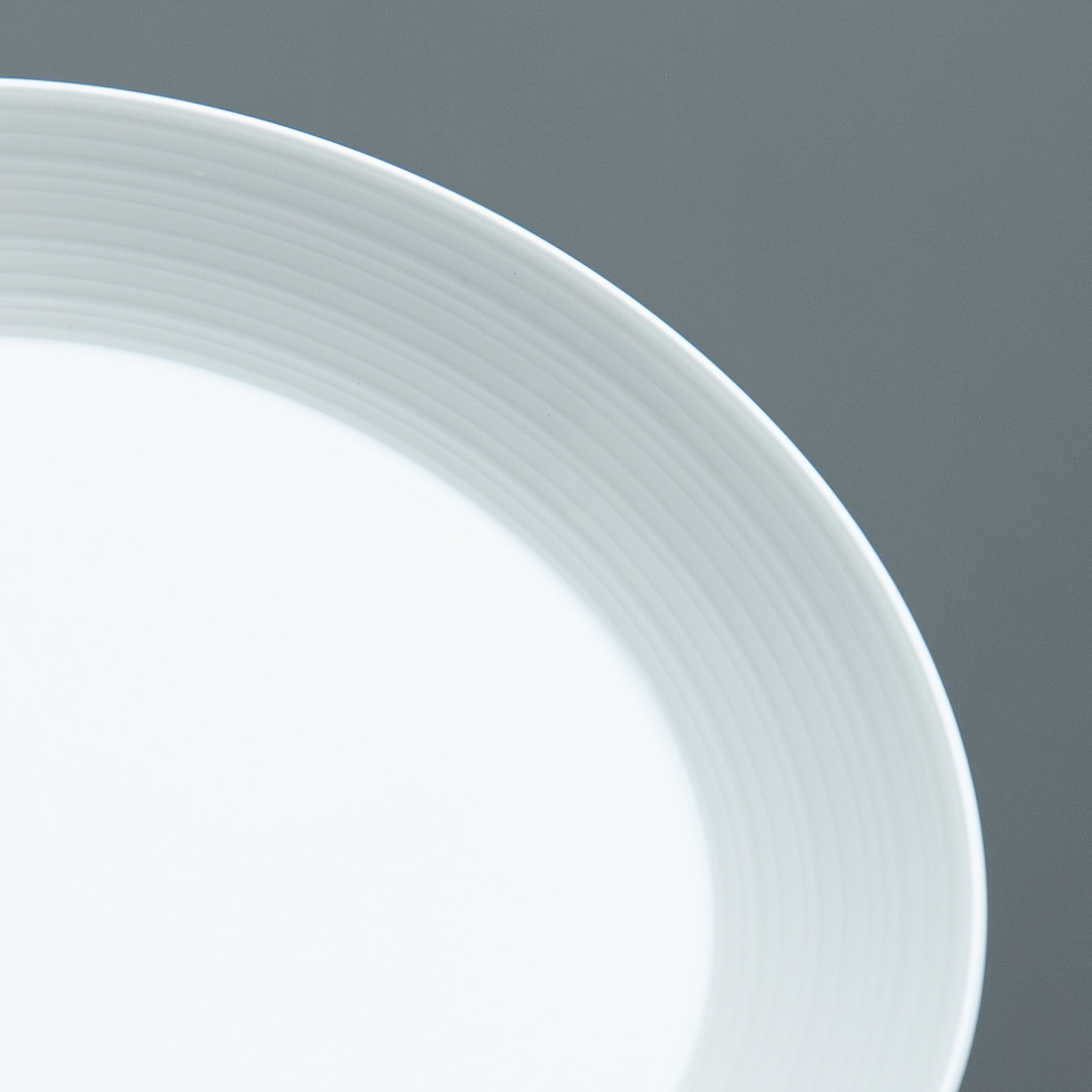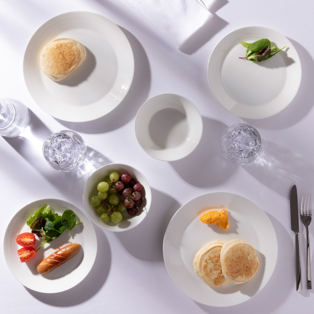 ホテル・レストランでも採用されているBridgeシリーズは、縁リムにレリーフがありスタイリッシュな印象で、盛りつけがしやすく料理も映える白いうつわです。