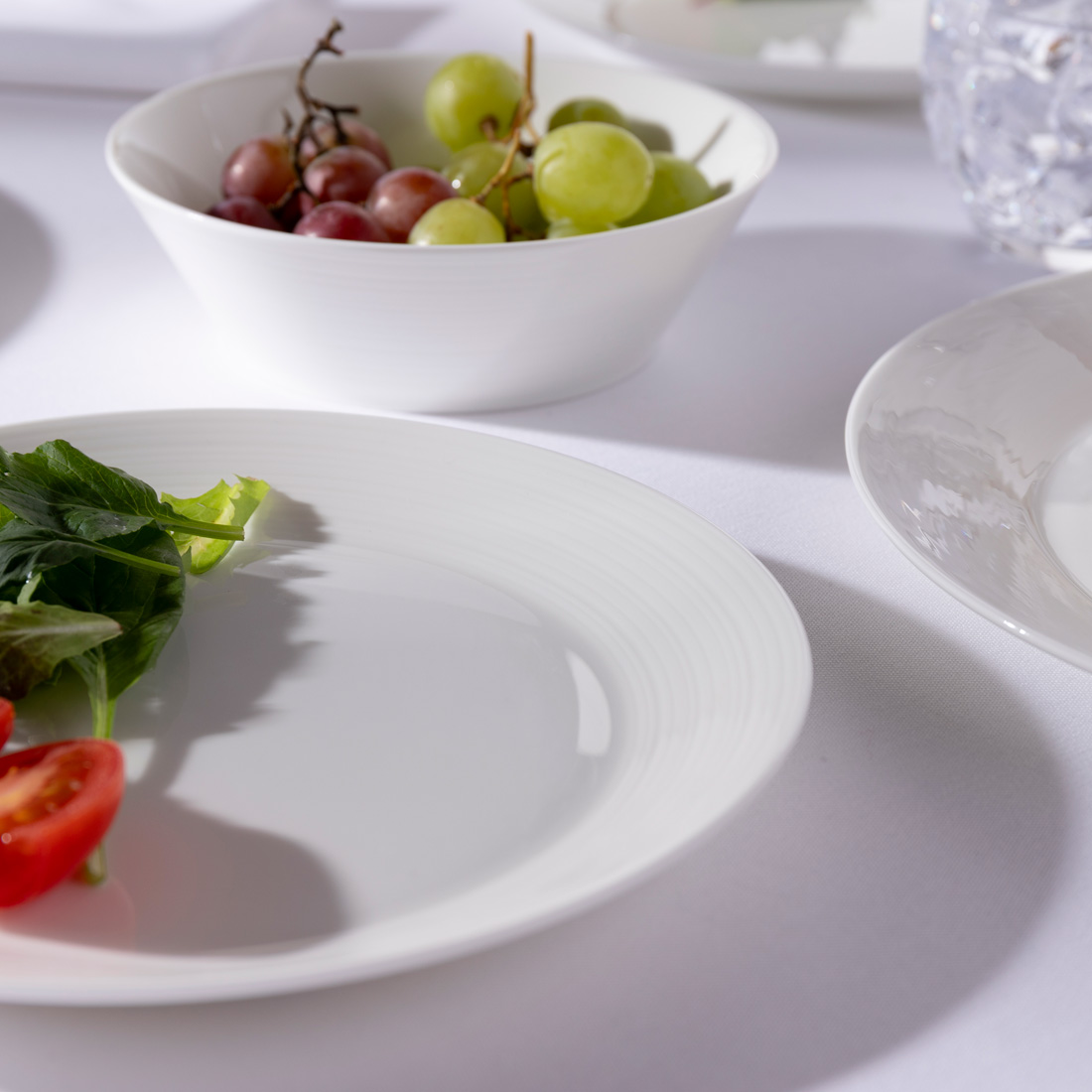 ホテル・レストランでも採用されているBridgeシリーズは、縁リムにレリーフがありスタイリッシュな印象で、盛りつけがしやすく料理も映える白いうつわです。