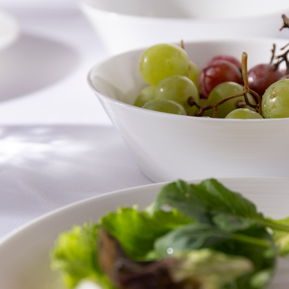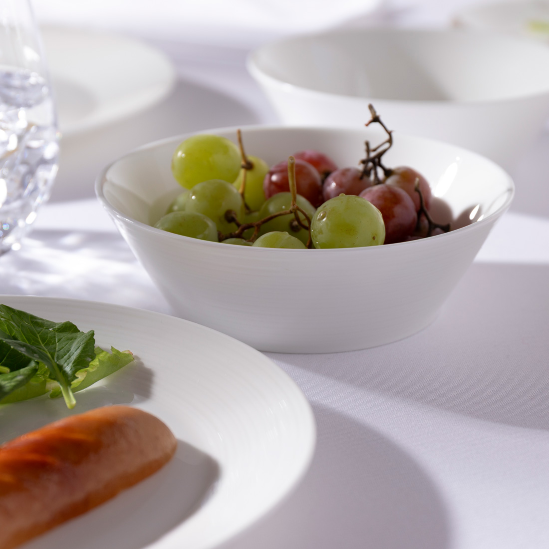 ホテル・レストランでも採用されているBridgeシリーズは、縁リムにレリーフがありスタイリッシュな印象で、盛りつけがしやすく料理も映える白いうつわです。