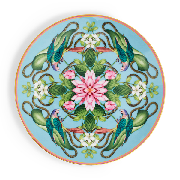 知恵と知識の発展、そしてアジアの熱帯地方では、神聖の象徴とされるピンクの睡蓮。大きな花から広がる華やかな香りに、鳥や蝶が集う姿が描かれています。