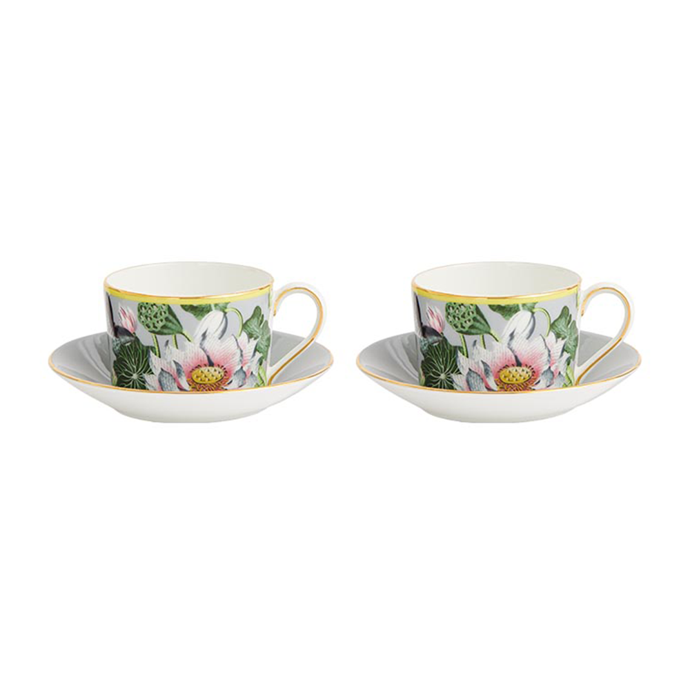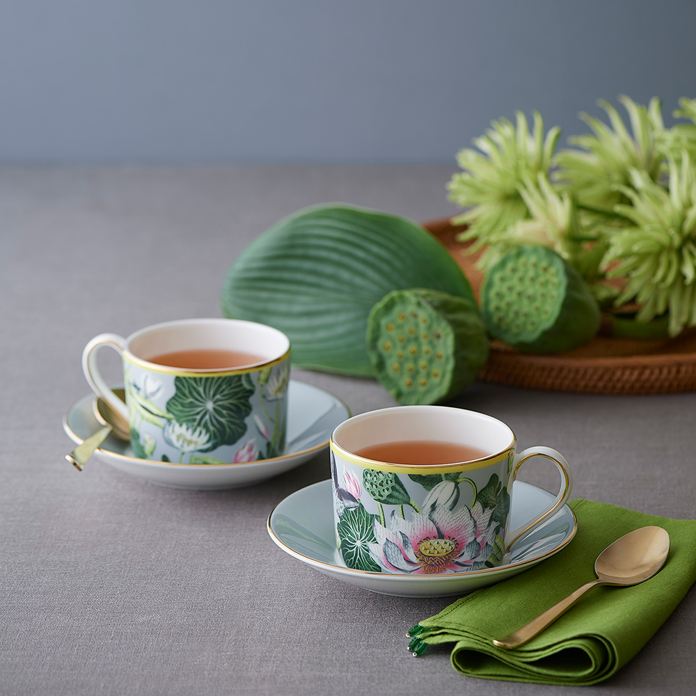 - ティーカップに美しく大きく咲き誇る花は、アマゾンの熱帯気候の恩恵を受けて育った睡蓮です。このパターンはジョサイア・ウェッジウッドの長男で、英国王立園芸協会の設立者のひとりであったジョン・ウェッジウッドが、外来植物の栽培に強い関心を持っていたことから1800年代に開発されたウォーターリリー柄に着想を得ています。